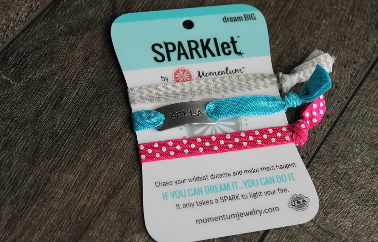 Meet the newest member of the Momentum family – SPARKlets! Available in six different themes, each SPARKlet comes with an inspirational pendant and three interchangeable, elastic bands at a very reasonable price of just $14.99. The idea is to use the SPARKlet in whatever way best suits you, but the four ideas featured on the website include using it as a wristlet, as a hair tie, as a water bottle label, or as a cell phone label. Not only are all of the bands super cute, they are also waterproof (in other words, “sippy cup friendly”) and hand-washable, and the pendants are made of lightweight, non-tarnishing aluminum.