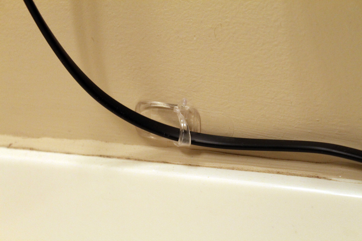 Just suspending it alone made the cord more manageable, but if you want to go one extra step, you can mount a couple of the 3M Command™ Clear Medium Cord Clips and thread your cord through those to really help get the cord out of the way and off the bathroom countertop.