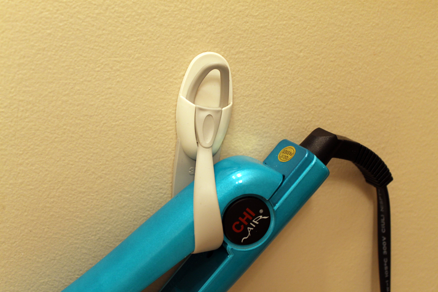 Let me introduce you to 3M Command™ Cord Bundlers if you haven’t already met. Cord bundlers? Actually yes, but not for the cord. We mounted the cord bundler to the wall and then suspended the flat iron by threading the plastic loop through the top part of the handle (where it makes a “V”) and letting it hang upside down. (See picture for reference.) This gets it off the countertop, but it remains convenient, and it can hang there while it is warming up or cooling off. It also put it out of my son’s reach, which gave me even greater peace of mind.