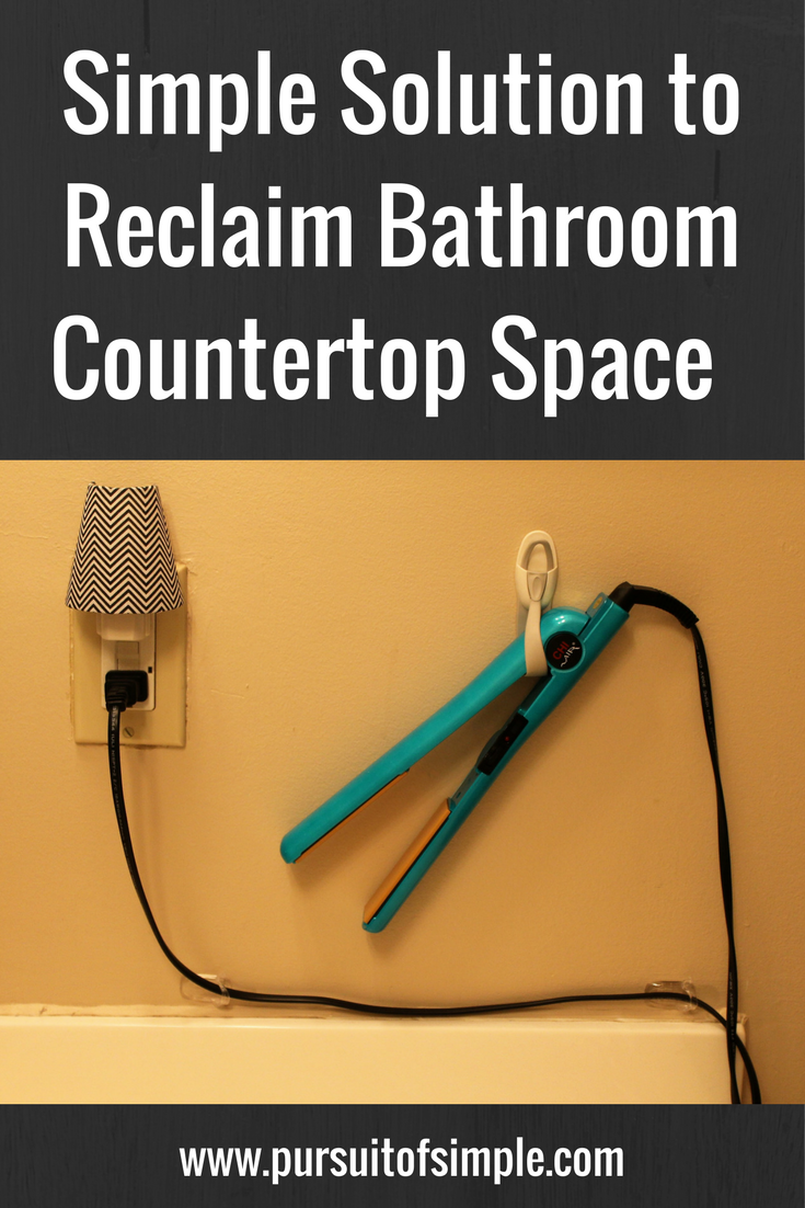 So needless to say, I was looking for a solution. I had seen those mesh containers that are intended to store your hairdryers, flat irons, and other similar products, but I really didn’t want to give up any more valuable countertop space than I already had, so I needed a different solution. I wanted something that would get the flat iron off the counter, keep it easily accessible, and allow it a safe way to cool. It seemed a tall order, but my husband had a great idea that not only solved the problem but also ended up being cheaper than those mesh containers.